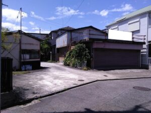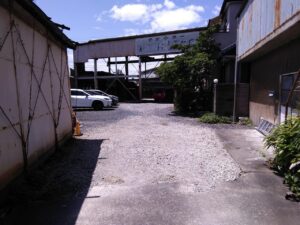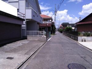 写真の右奥に見える建物の横も車1台分は通れる広さがございます。