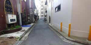 前面の路地は対面通行なのでどちらからでも